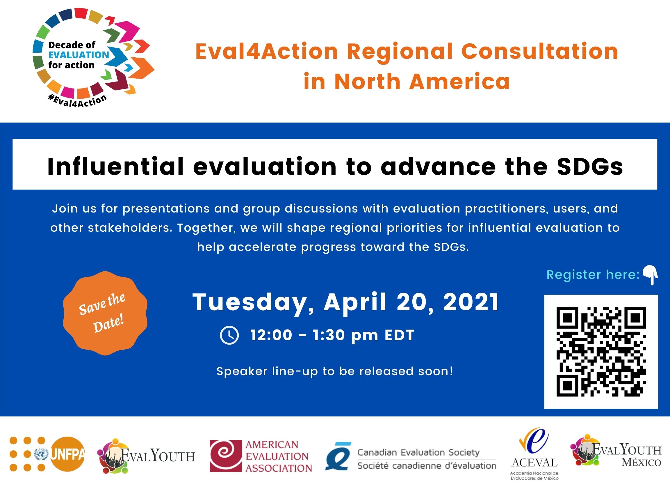 The Eval4Action North American Regional Consultation will be held on April 20, 2021 from 12:00-1:30 pm (EDT) / 1:00-2:30 (ADT) via Zoom (see flyer below). Eval4Action is a global campaign that calls upon all actors, everywhere to accelerate the delivery of the Sustainable Development Goals, by advocating for stronger evaluation capacities and evidence-based policies. The North American Consultation will be an opportunity for evaluation practitioners, users, and other stakeholders to shape regional priorities and promote influential evaluation, particularly to help address the SDGs. The consultation will include brief remarks by invited speakers, followed by facilitated group discussions. More info on regional consultations can be found here.